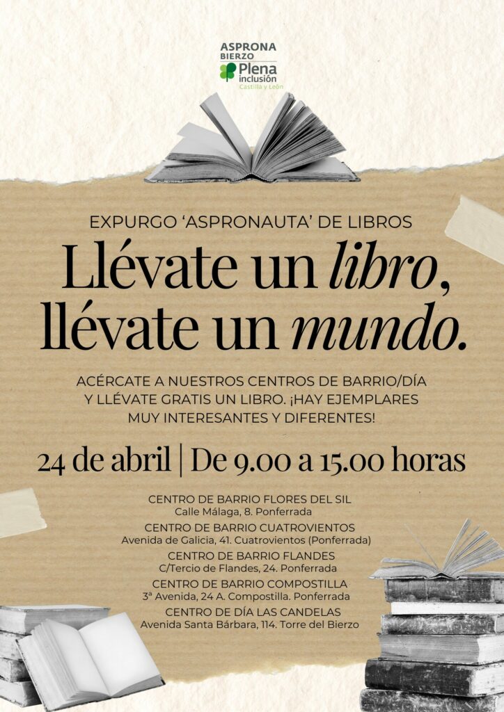 De forma complementaria a su participación en la Feria del Libro, Asprona Bierzo celebrará un expurgo de libros. Será el próximo viernes 24 de abril en horario de 9.00 a 15.00 horas en sus centros de día y de barrio. Todas las personas interesadas podrán acercarse a Flores del Sil, Cuatrovientos, Flandes, Compostilla y Torre del Bierzo y llevarse de forma gratuita ejemplares de los fondos de la entidad.